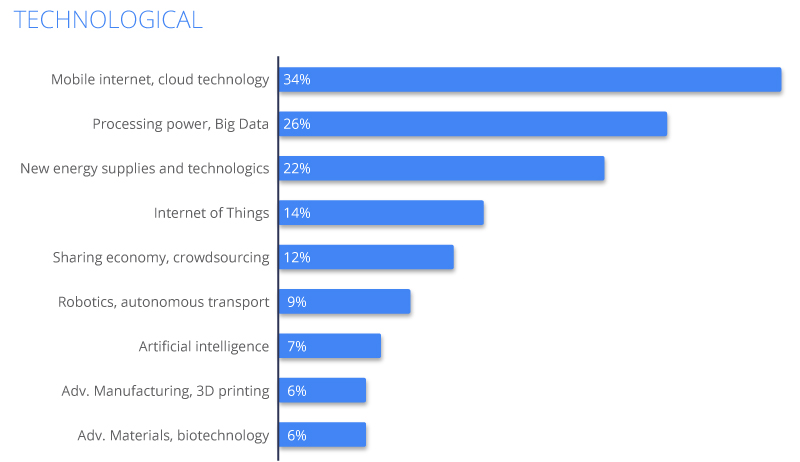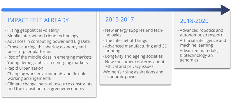 En l’estudi presentat pel World Economic Forum The Future of Jobs, Employment, Skills and Workforce Strategy for the Fourth Industrial Revolution , el gener del 2016, podem veure l’impacte que tindran les tecnologies en la transformació del treball en els anys vinents. Queda molt ben reflectit en la figura següent: