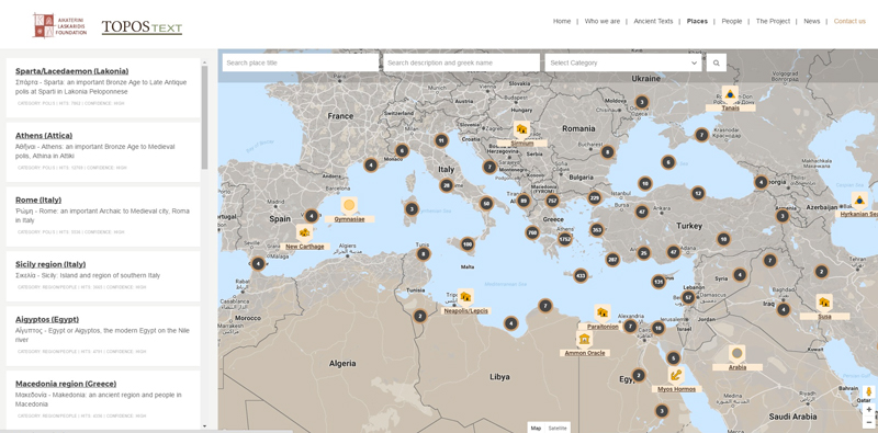 ToposText és una col·lecció indexada de textos antics i llocs mapats rellevants de la història i de la mitologia dels antics grecs, des del període neolític fins al segle ii aC. Es va inspirar en dues dècades d’exploració de Grècia amb cotxe, a peu o amb bicicleta, i als esforços matussers per a agrair la informació rellevant de Pausànias o d’altres fonts primàries. El desenvolupament de dispositius electrònics mòbils des de 2010 ha coincidit amb un assortiment cada vegada més ampli de textos antics disponibles a internet. El projecte Pleiades, amb la seva base de dades descarregable de milers d’antics topònims i coordenades, va obrir la porta a indexar geogràficament textos antics, utilitzant un mapa de Grècia com a interfície bàsica.